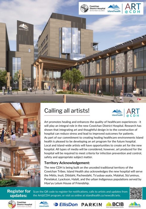 Artwork will be informed by all people who are served by the hospital, including First Nation communities in the region. We also acknowledge the new hospital will serve the Stz'uminus, Le'eyqsun, Spune'luxutth, MÁLEXEŁ, Xeláltxw, Ditidaht, Pacheedaht, Ts'uubaa-asatx, Métis, Inuit, urban Indigenous population and Quw'utsun peoples.