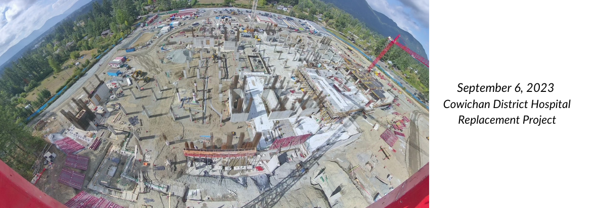 Clear blue skies above the future Cowichan District Hospital, looking south to Somenos Lake. September will continue with to see fast development indoors, with the Emergency Department leading the way with nursing station installs.